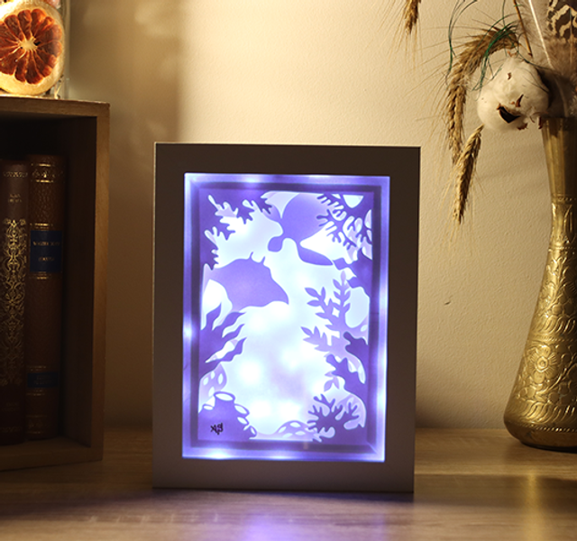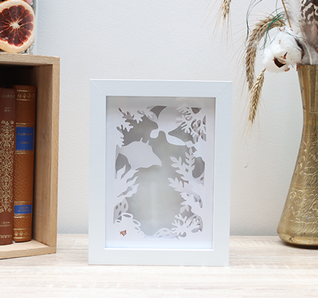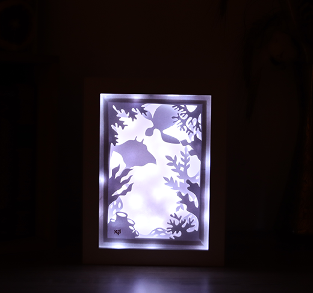 Des feuilles blanches découpées, un cadre blanc et une lumière blanc, pour un univers épuré.