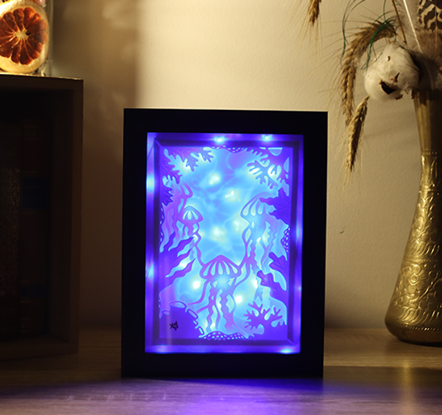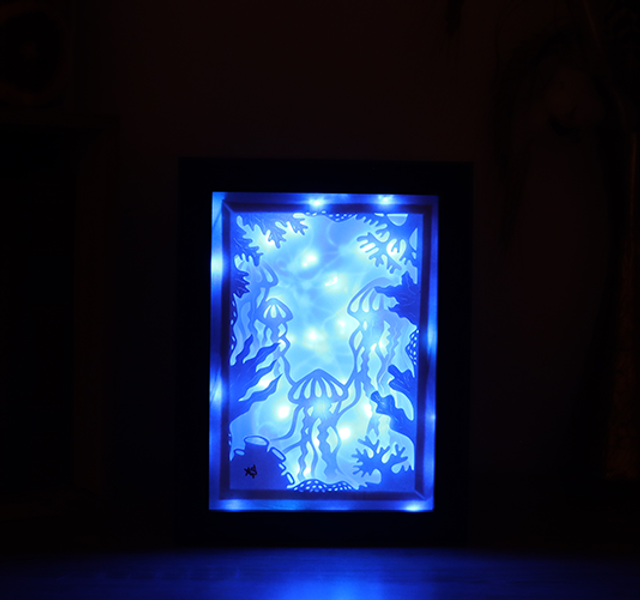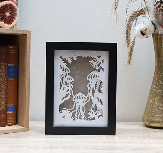 Des méduses en papier blanc découpé, un cadre noir, une lumière bleu.
